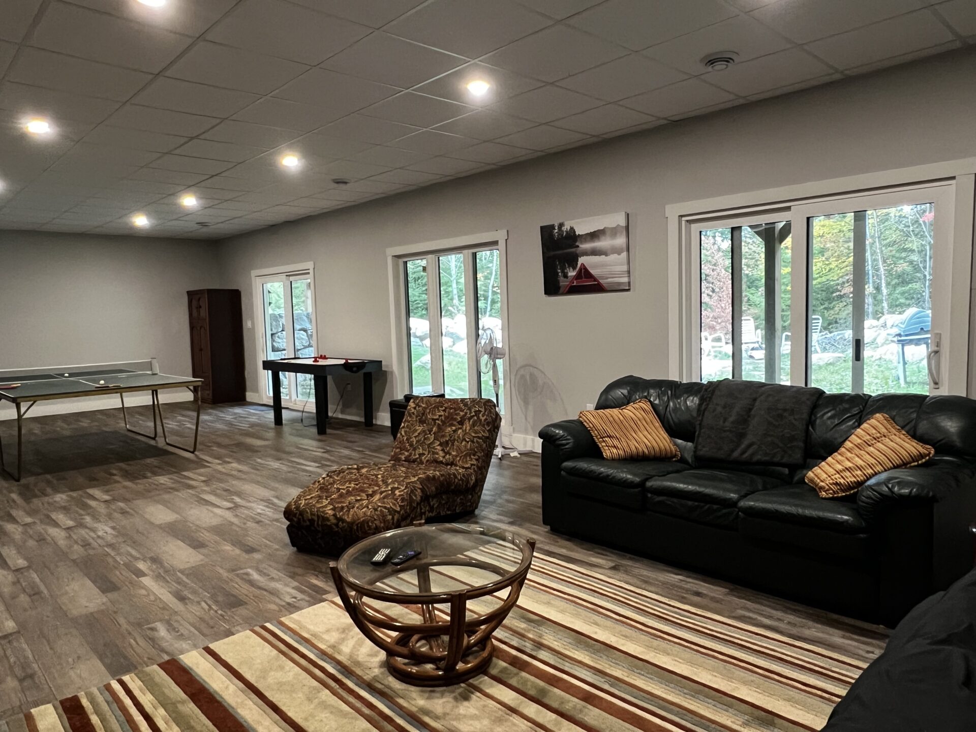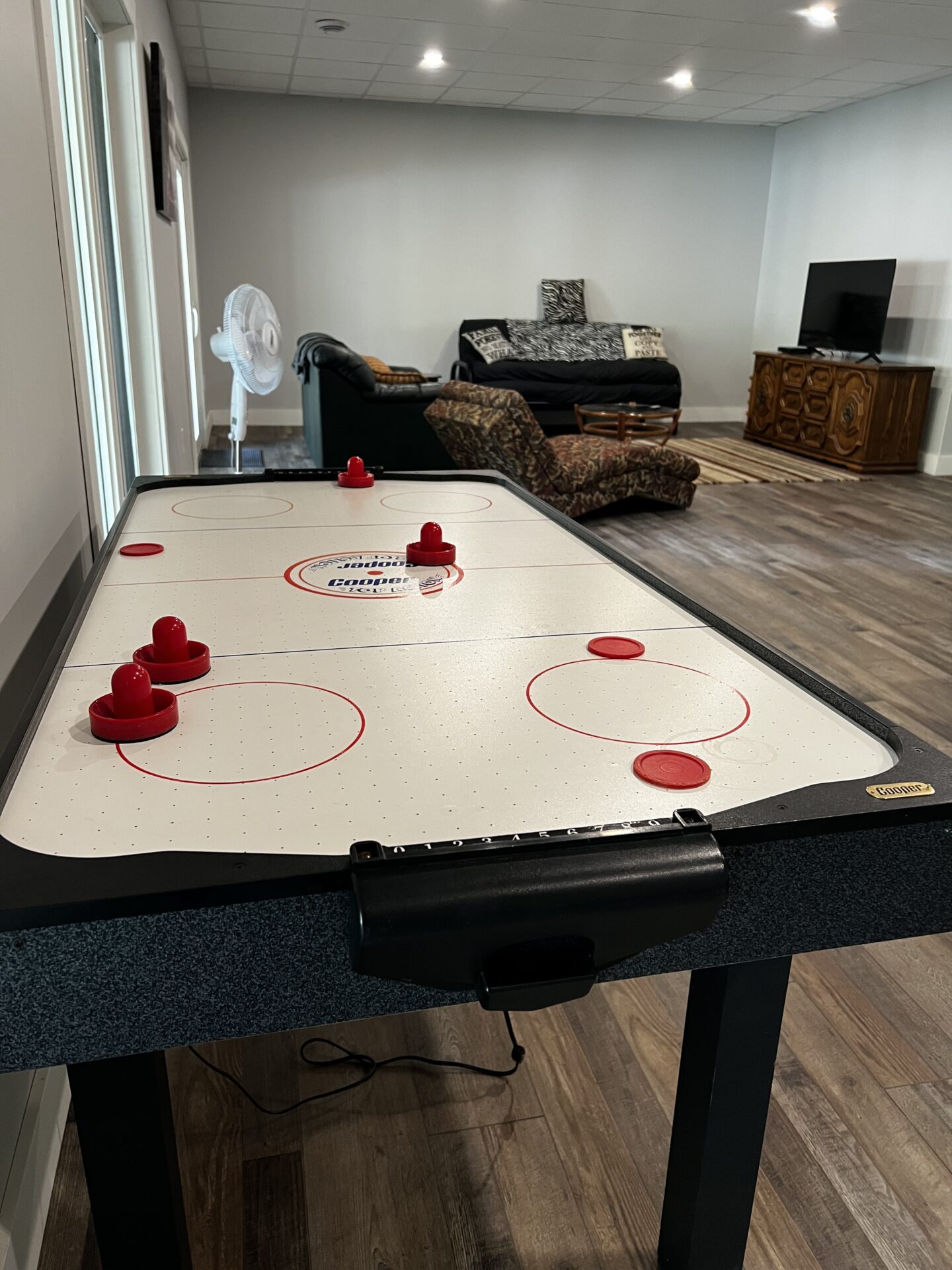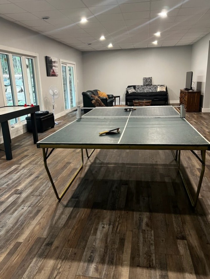 Fibre Optics Wifi!, AC! Good cell service, washer, and dryer, UV drinking water system, water cooler, propane BBQ, ceiling fans, furnace, dishwasher, drip coffee maker, Two smart TVS for streaming, outdoor furniture, fire pit. Games: air hockey, bean bag toss, ping pong, tick tac toss, and ring toss; books, DVDs, and some lifejackets. Level driveway and parking for multiple cars.